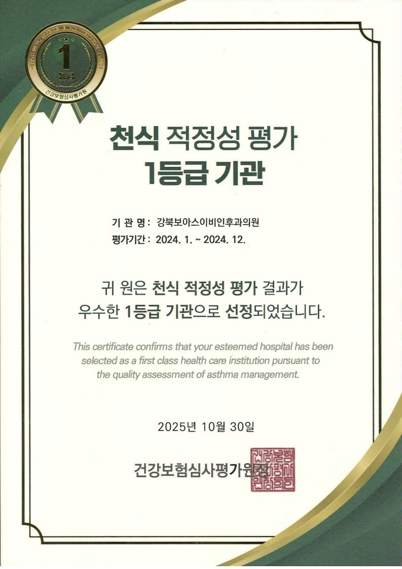 천식 적정성 평가에서 높은 점수를 받아 1등급으로 선정되었습니다.